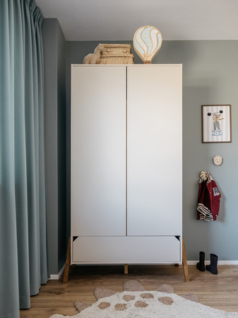2-türiger, geräumiger Schrank ist eine unentbehrliche Ausstattung der Kinderzimmers. Der Schrank ist zweiteilig: ein Teil enthält Bügel, auf dem die Kleidungsstücke aufgehängt werden können, der andere Teil enthält voluminöse Fächer. Der Schrank wird von einer Schublade ergänzt, die eine unabhängige Einheit unter dem Schrank bildet.