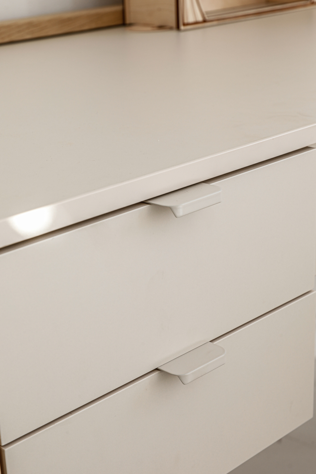 - Desktop, body, and fronts: laminated chipboard in latte color