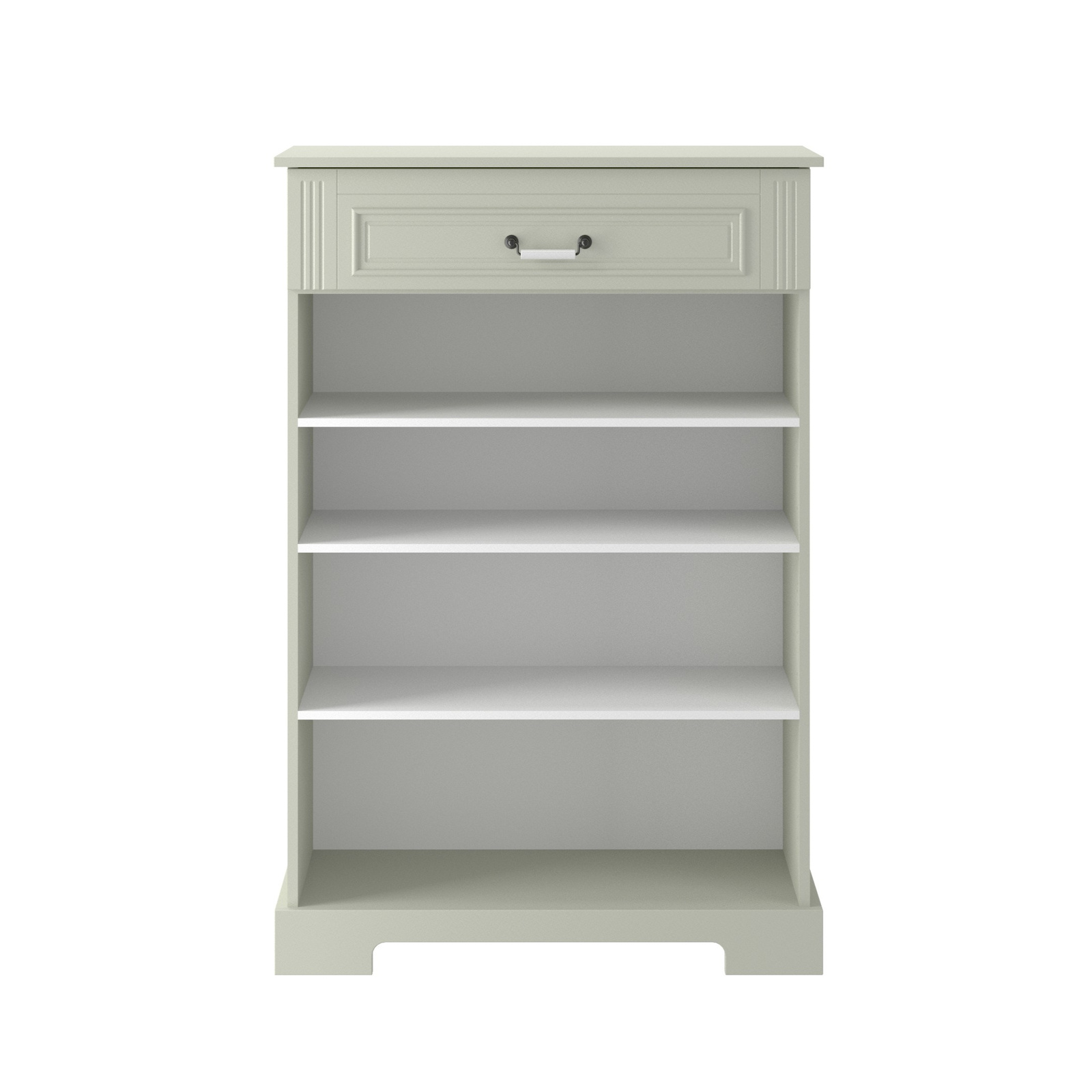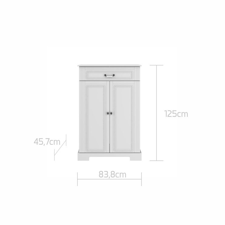 Wysoka komoda dwudrzwiowa Ines łączy klasyczny design z praktycznym układem wnętrza. Wyposażona w cztery półki (trzy regulowane) oraz pojemną szufladę, zapewnia wygodne przechowywanie ubrań, akcesoriów i drobiazgów. Ręcznie wykonane porcelanowe uchwyty oraz lakierowane fronty w kolorze sage nadają jej elegancji. Komoda została wykonana z bezpiecznych, certyfikowanych materiałów i posiada możliwość montażu do ściany.