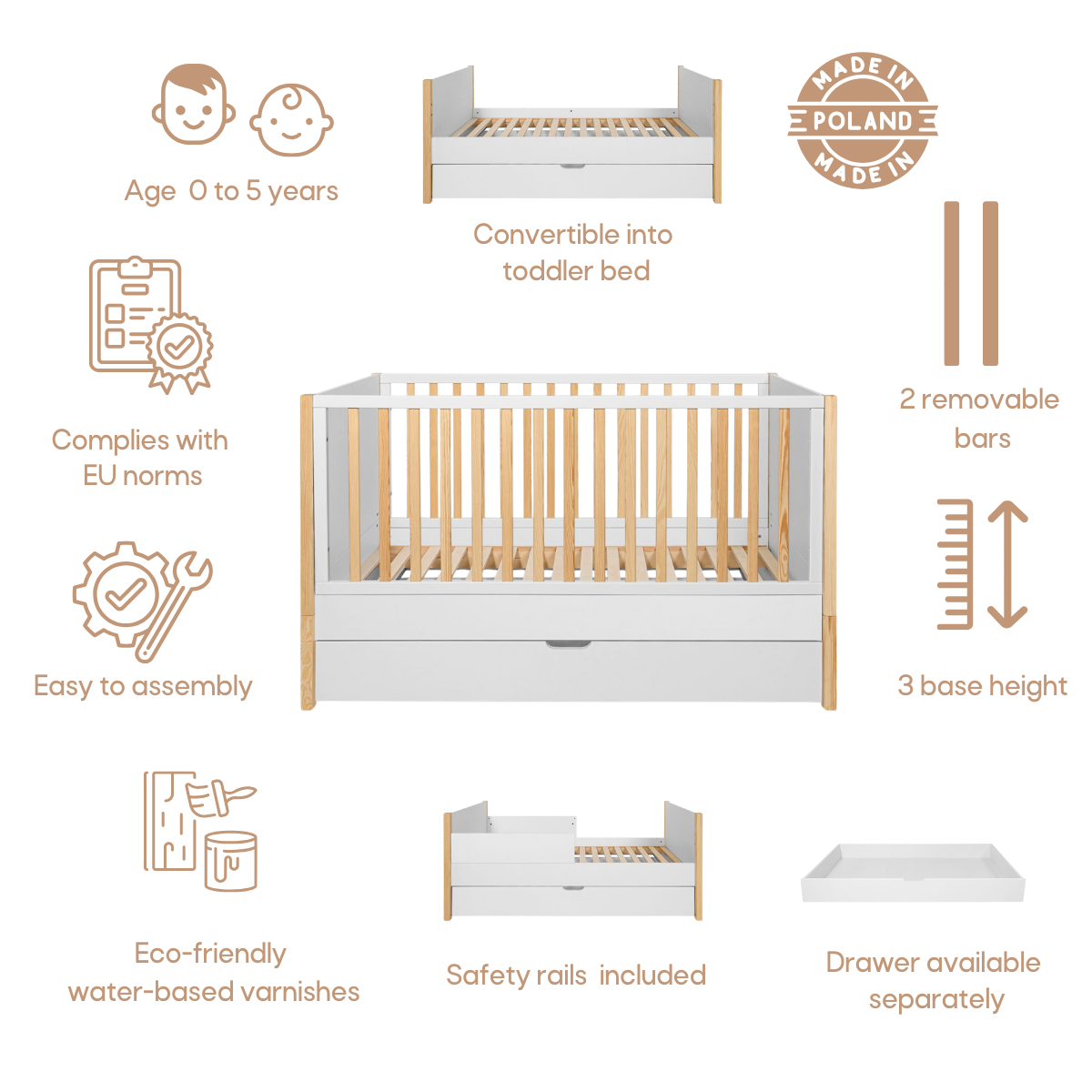 ->w zestawie dwie barierki ochronne, które powstają podczas transformacji łóżeczka w tapczanik i zabezpieczają dziecko przed wypadnięciem z łóżeczka podczas snu